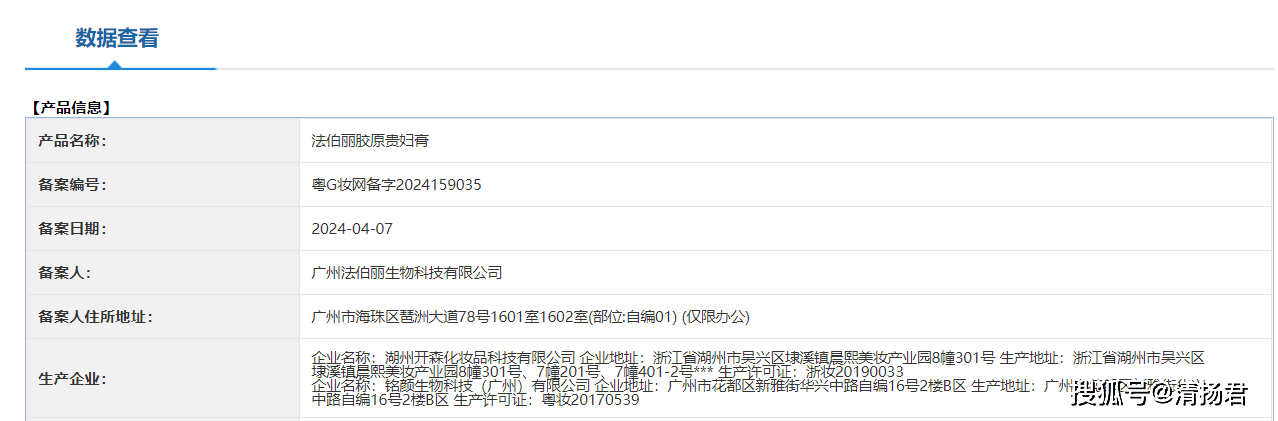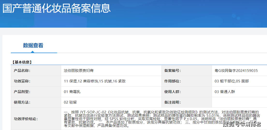 经清扬君查询,法伯丽胶原贵妇膏的首次备案时间为2024年4月7日,与实验数据相隔长达6年。为何该产品未在实验报告完成后及时备案?这一问题值得深思。清扬君推测,法伯丽2019年进行实验的产品与2024年备案的胶原贵妇膏可能并非同一产品,但中山大学附属第三医院并未就此问题给出明确答复。