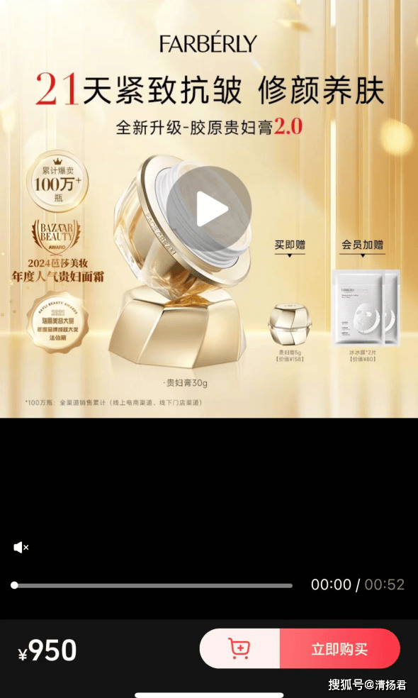 不过该产品销售的很好,法伯丽在抖音旗舰店等多个电商平台宣传“累计销量100万+瓶”。如果按每瓶零售价950元计算,该款产品销售额至少超过9.5亿元。