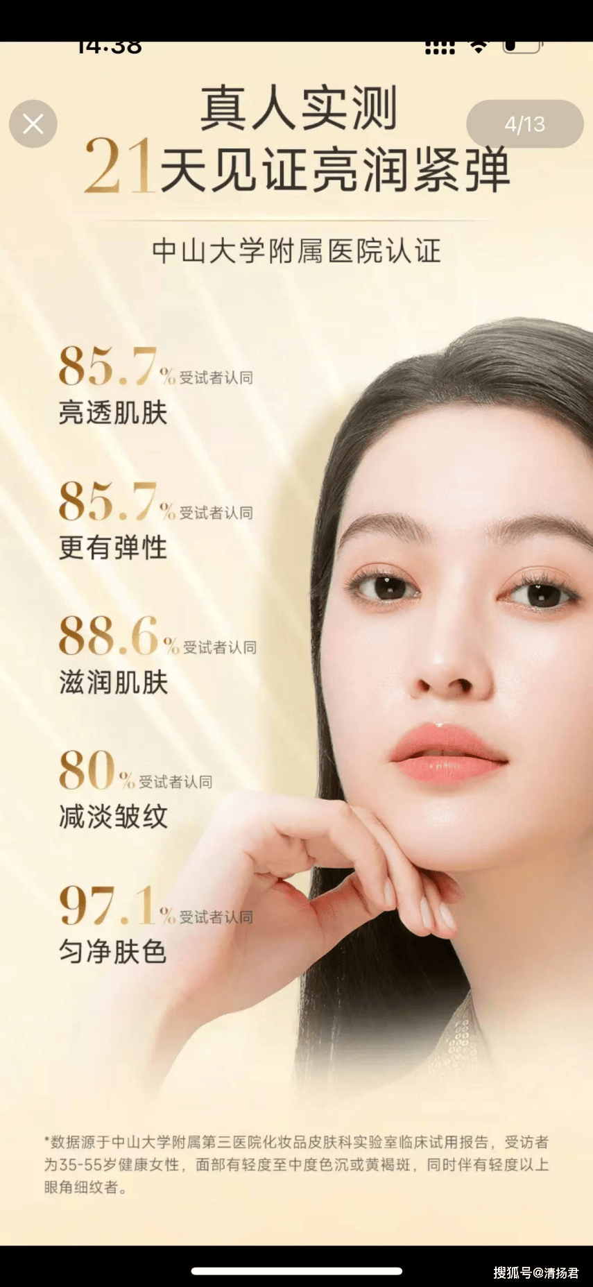 值得关注的是,该产品还宣传“中山大学附属医院认证”、“85.7% 的受试者认同产品能够亮透肌肤”、“85.7% 的受试者认同产品使肌肤更有弹性”、“88.6% 的受试者认同产品能够滋润肌肤”、“80% 的受试者认同产品能够减淡皱纹”、“97.1% 的受试者认同产品能够匀净肤色”、“这些数据来源于中山大学附属第三医院化妆品皮肤科实验室的临床试用报告”,但并未提供检测报告名称和编号。
