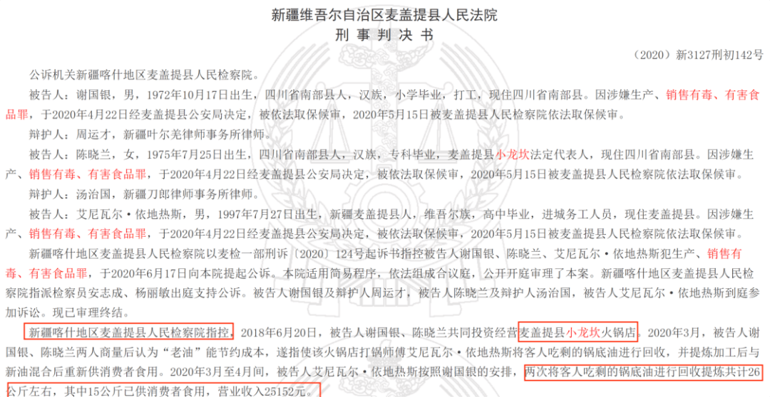 判决书显示,小龙坎在新疆喀什地区麦盖提县的门店,将客人吃剩的锅底油进行回收提炼共计26公斤左右,其中15公斤已供消费者食用。三名被告人均被判以刑罚。