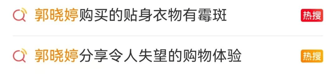 3月16日,女演员郭晓婷相关的词条——“郭晓婷购买的贴身衣物有霉斑”“郭晓婷分享令人失望的购物体验”等,冲上热搜。