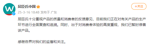 3月16日,屈臣氏发文回应一次性内裤问题,其提到:出于对消费者体验的高度重视,我们已暂时停售该产品。