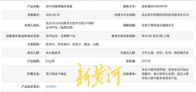 包装上标注的“降落灵”属于非注册别名,而该保健品真实的注册名称应为“佰年明德牌槐仲胶囊”,这种别名容易让消费者误以为是具有降血压功效的药品。