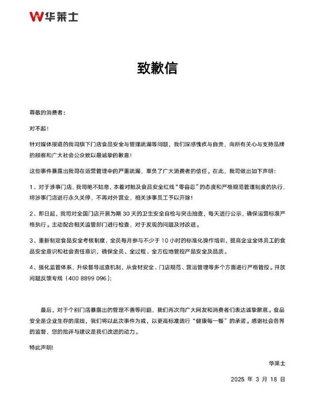 针对门店被曝给过期食材“换签续命”,3月18日华莱士官方微博发布致歉信称,将涉事门店进行永久关停,不再对外营业,相关涉事员工予以开除。此外,即日起,公司对全国门店开展为期30天的卫生安全自检与突击抽查,每天进行公示,确保运营标准严格执行。主动配合相关监管部门进行检查,对于发现的问题及时改进。
