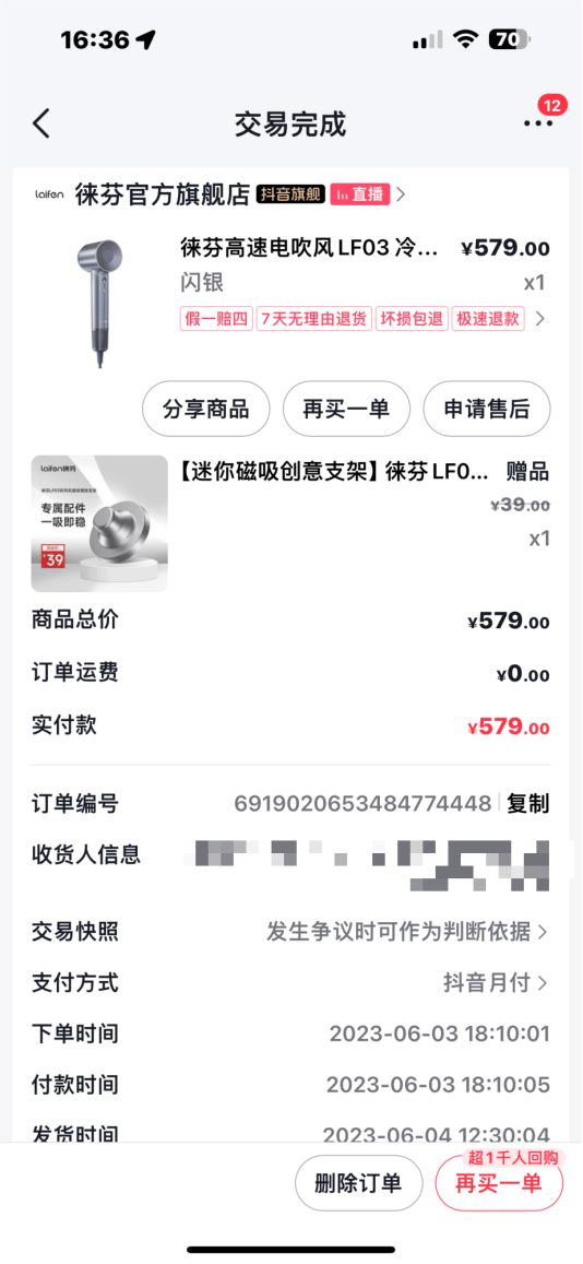 6月3日购买于抖音徕芬官方旗舰店,价格579元。10月25日晚10点左右事故发生后,叶先生次日联系了官方客服,但客服要求将产品寄回总部检测,叶先生对此并不同意。吹风机仅使用一年多且在正常使用中出现这种情况,令叶先生对产品质量及安全性产生质疑,他希望能上门检测,查清楚究竟是什么原因,并对身体损伤及吹风机费用做出赔偿,但客服至今没有回应。