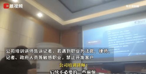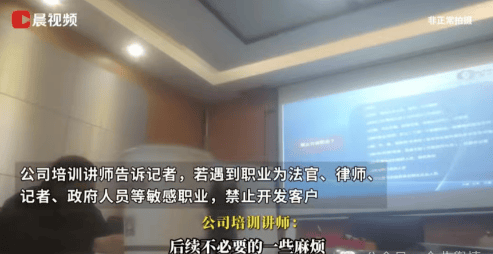 新入职员工需先经过培训后才能上岗,培训讲师会介绍公司销售注意事项。讲师提到,单次向客户销售不超过3000元,一个客户购买产品费用总计不能超过10000元;若遇到客户职业为军人、法官 司法从业人员、律师、记者、政府人员等,则禁止开发。“为什么不去开发,不是说我们公司不正规,或者哪里有鬼,而是我们要尽量去避免一些后续不必要的麻烦和风险。”