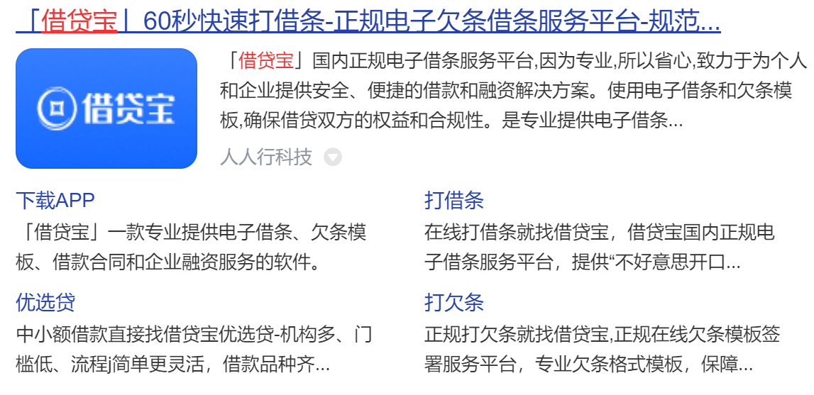 官网信息显示,借贷宝是打借条、打欠条、个人借钱、企业融资的工具,开发了“借贷宝”APP、“打欠条”小程序、“亲友融”小程序;平台登记借条1.2亿笔,帮助1000万借款人成功借款。