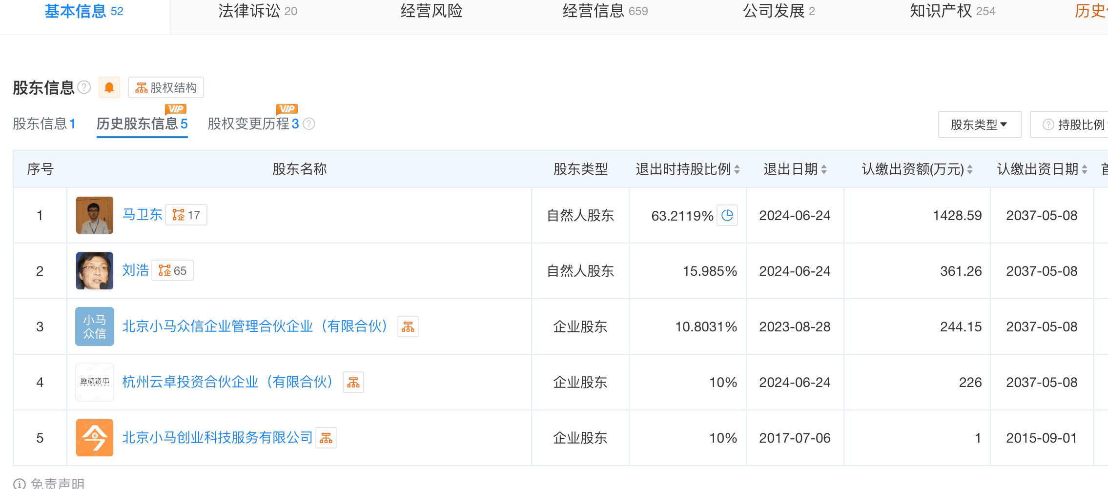其中,马卫东、刘浩、杭州云卓投资合伙企业(有限合伙)在2024年6月24日同时退出股东行列。退出时,马卫东持股63.2119%,刘浩持股15.985%,杭州云卓投资合伙企业持股10%。