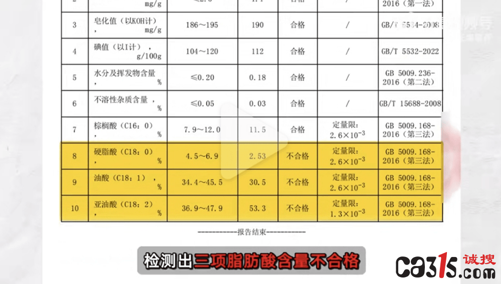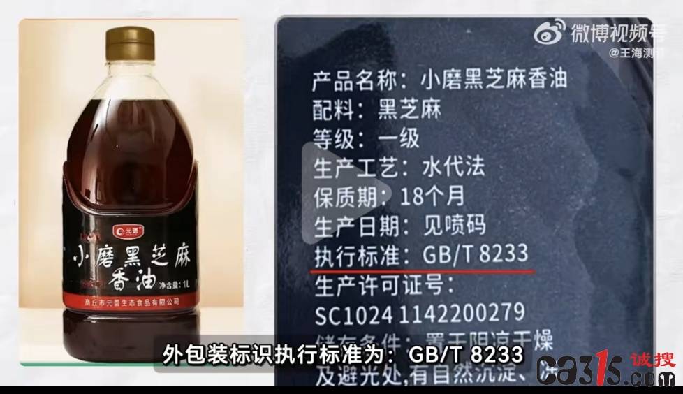 根据国家标准《GB/T 8233-2018》,纯芝麻油的硬脂酸含量应在4.5%~6.9%之间,而这款香油的硬脂酸含量仅为2.53%;油酸含量标准为34.4%~45.5%,实测值却只有30.5%;亚油酸含量标准为36.9%~47.9%,实测值却高达53.3%。三项指标全部“翻车”,显然这款香油的质量问题不小。