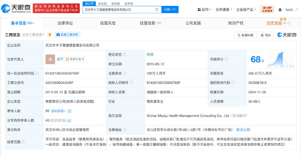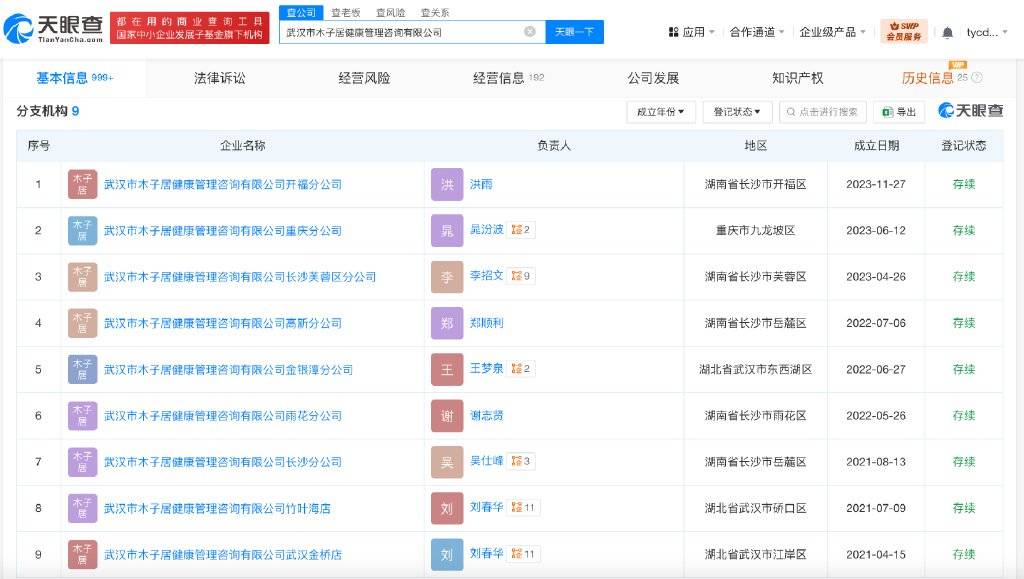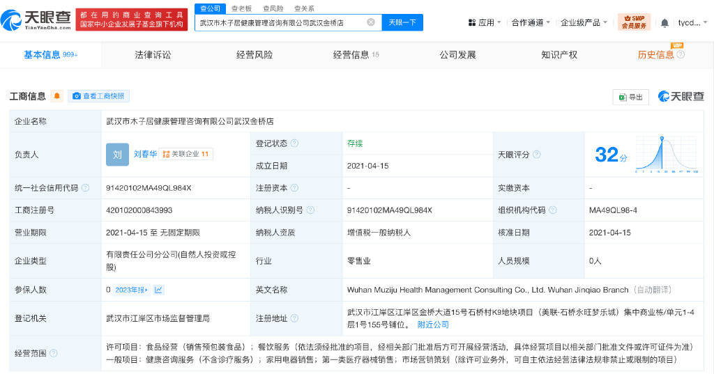 天眼查App显示,武汉市木子居健康管理咨询有限公司武汉金桥店成立于2021年4月,负责人为刘春华,经营范围含食品经营、餐饮服务等。总公司信息显示,其总公司为武汉市木子居健康管理咨询有限公司,该公司成立于2015年5月,法定代表人为胡平,注册资本700万人民币,经营范围含食品经营、餐饮服务等,由刘春华、王倩、冯海雄共同持股。分支机构信息显示,该公司拥有9家分支机构,均为存续状态。