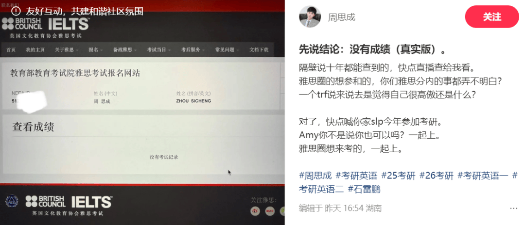 考研名师周思成雅思成绩被质疑造假:曾质疑何凯文英语造假
