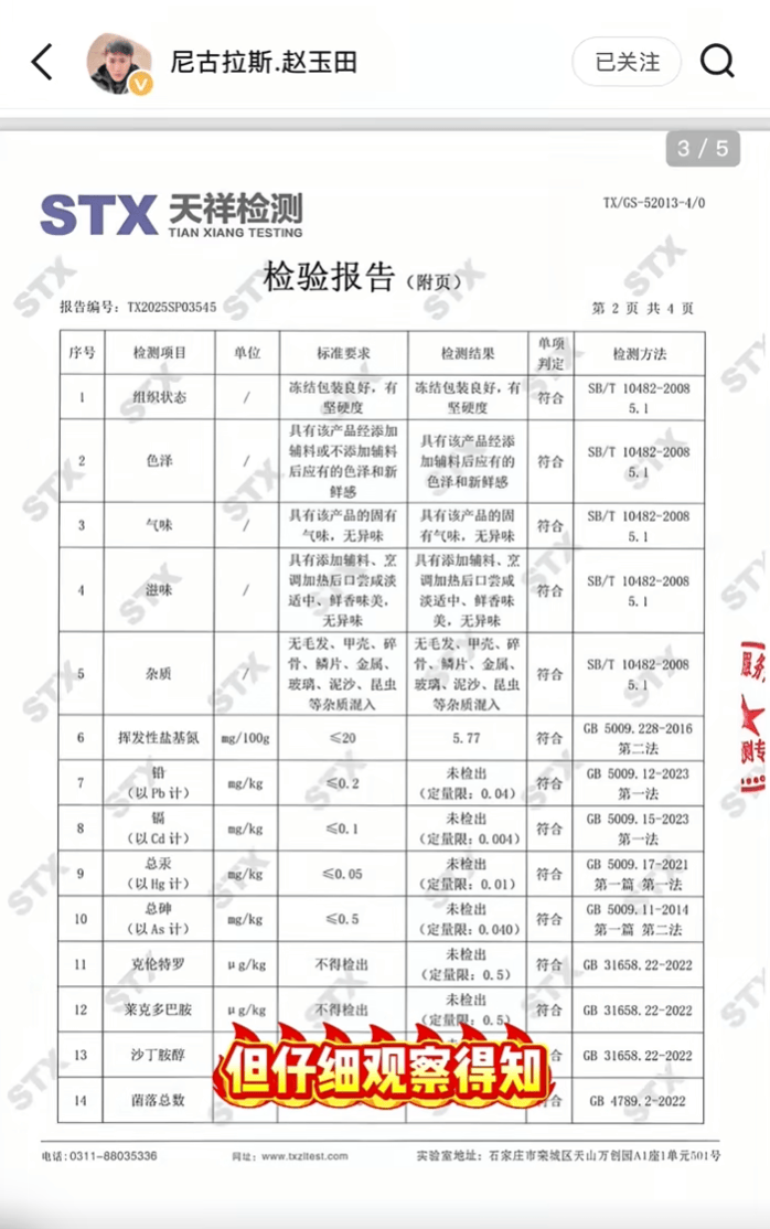 3月6日,“赵玉田 ”在社交账号发布一份合格的产品检测报告。然而沈先生称,自己举报的是产品非法添加保水剂,这份检测报告检测的是菌落总数。