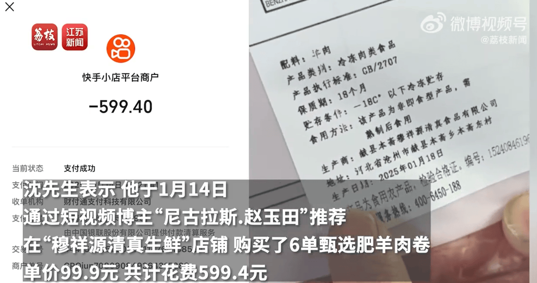 近日,消费者沈先生在直播间花费599.4元购买6单羊肉卷,经检测实为含有焦磷酸盐、正磷酸盐、柠檬酸盐等添加剂的合成肉。于是,沈先生实名举报《乡村爱情》“赵玉田”扮演者吴云飞,在直播间售卖所谓“原切羊肉”。