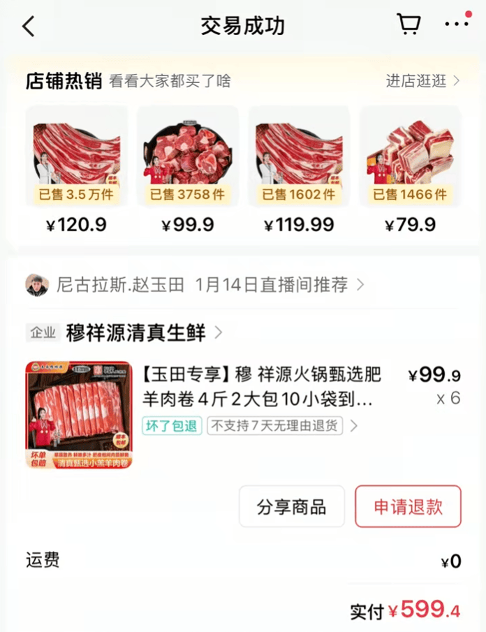 据相关直播视频显示, “赵玉田”在直播中称:“这个级别的羊肉卷,你在外面买不着,外面基本都是拼接的羊肉卷,跟我这个鲜羊肉卷不是一个级别。”