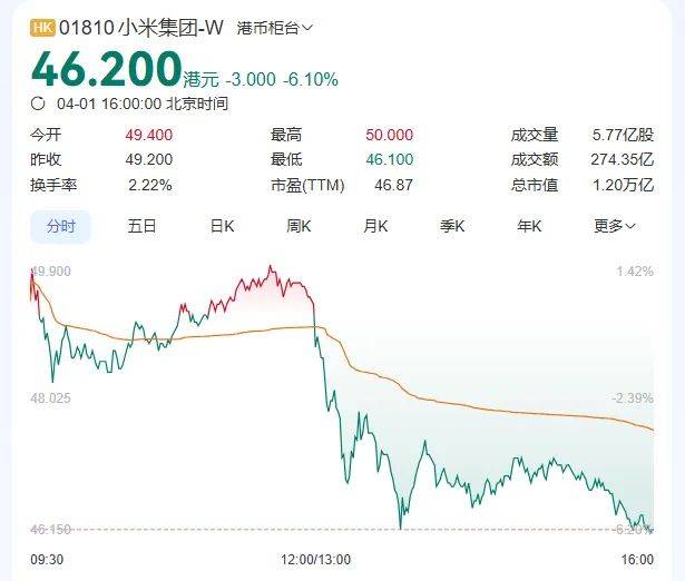 截至4月1日下午15时55分,小米集团(股票代码:01810.hk)股价下跌近6%。