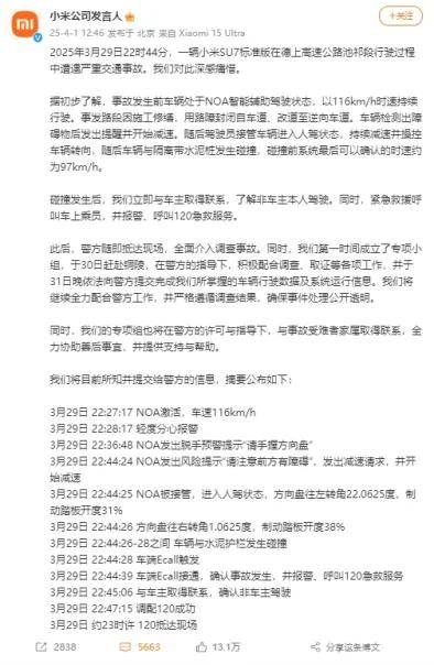 小米公司称,据初步了解,事故发生前车辆处于NOA智能辅助驾驶状态,以116km/h时速持续行驶。事发路段因施工修缮,用路障封闭自车道、改道至逆向车道。车辆检测出障碍物后发出提醒并开始减速。随后驾驶员接管车辆进入人驾状态,持续减速并操控车辆转向,随后车辆与隔离带水泥桩发生碰撞,碰撞前系统最后可以确认的时速约为97km/h。