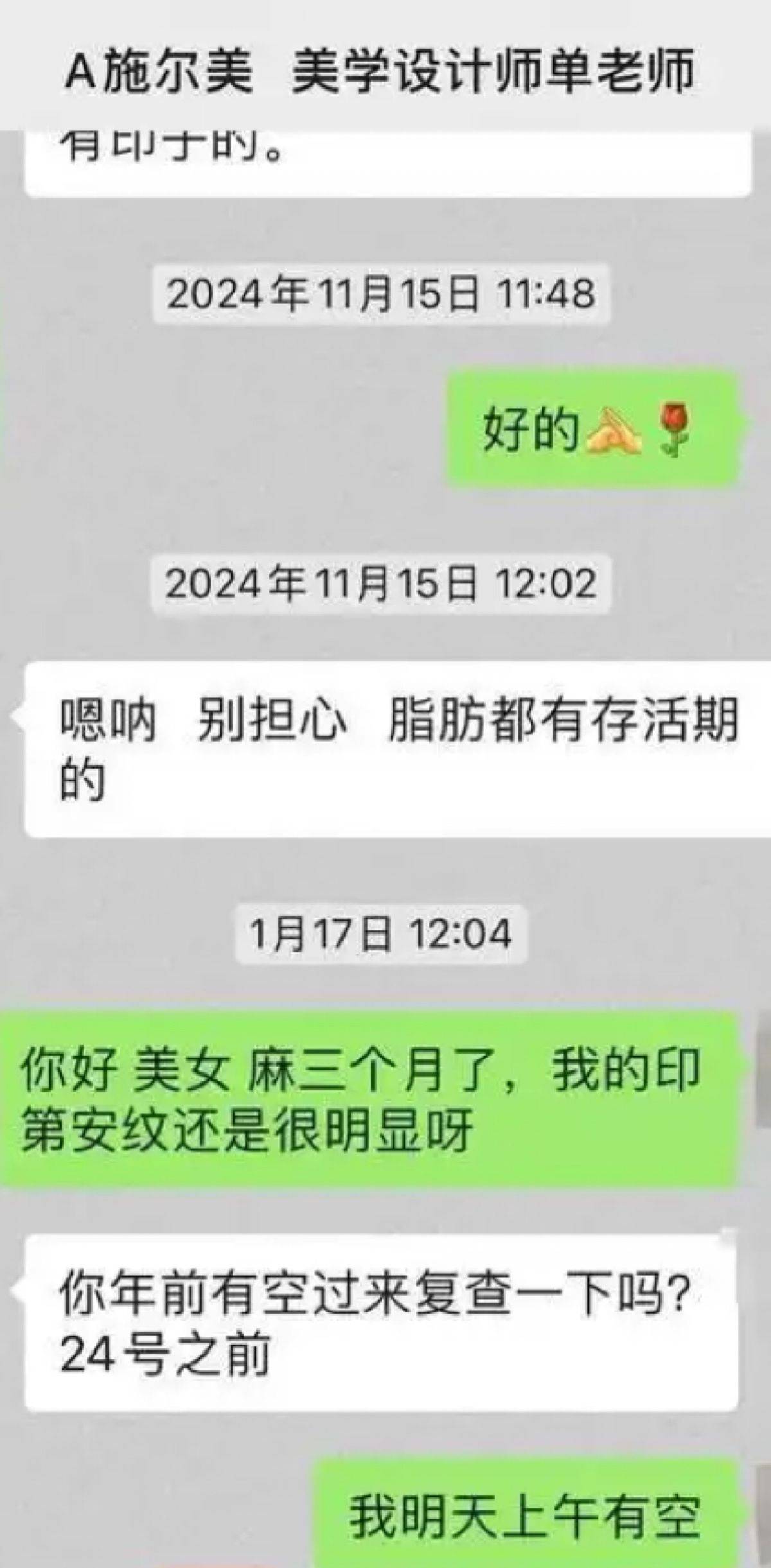 从金女士提供的微信聊天记录中可以看到,2024年11月6日,她向医院单姓咨询师咨询效果时,咨询师告诉她填充的脂肪存活需要2到3个月才能稳定。11月16日,金女士再次质疑效果时,咨询师建议她“保持耐心”。然而,直至今年1月17日,在印第安纹凹陷问题持续未见好转的情况下,院方才通过电话通知金女士安排专项复查。