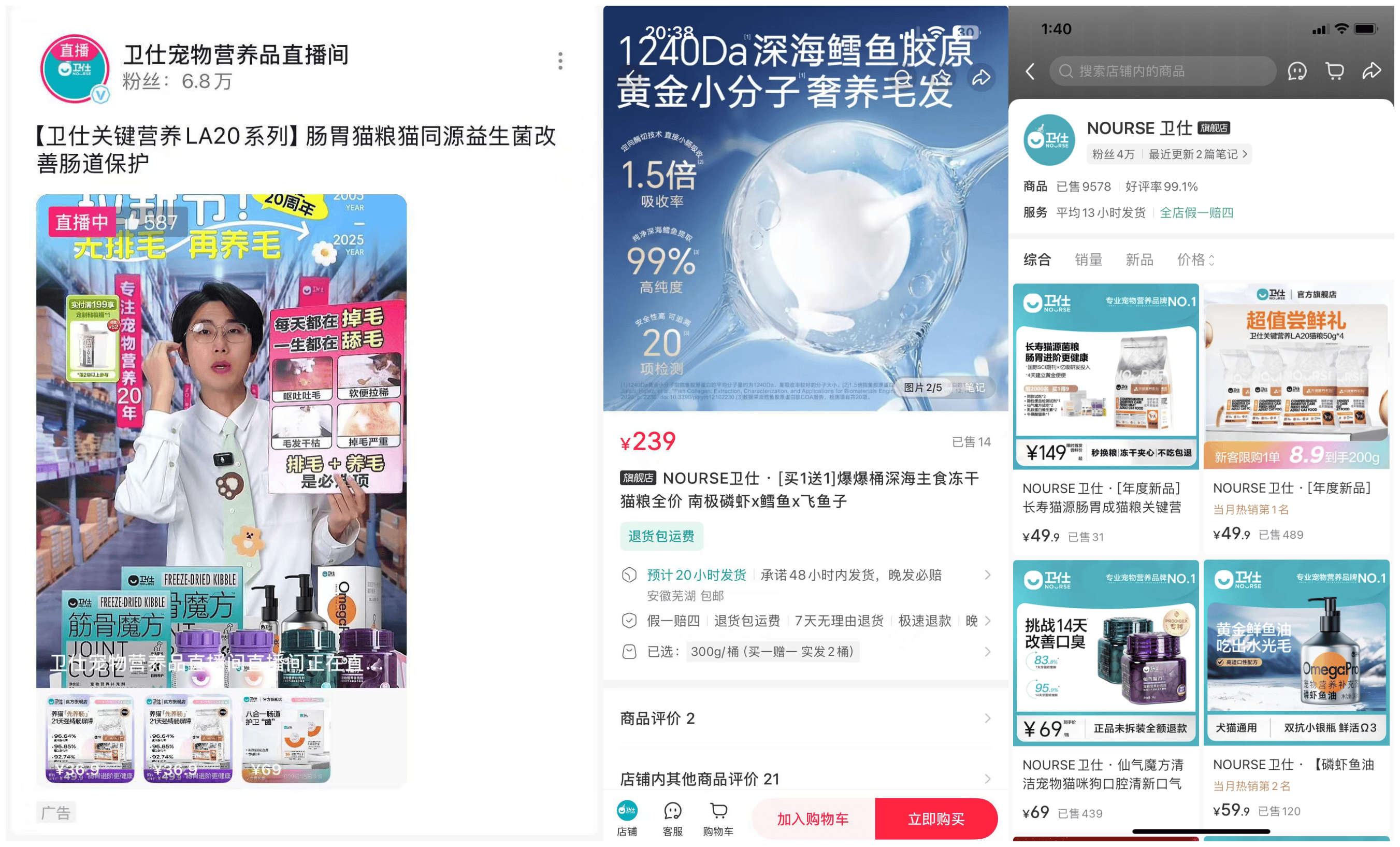 卫仕宠物近年来在高档猫粮和宠物营养品方面加大宣传推广,特别是在抖音、快手等短视频平台上通过直播带货的方式进行销售。记者注意到,网上有关卫仕宠物的宠物营养品宣传内容中,经常会出现添加益生菌、改善肠道等表述。