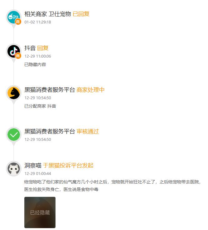 还有消费者去年12月底投诉称给宠物吃了卫仕宠物的仙气魔方几个小时后,宠物开始狂吐不止了,之后送到宠物医院抢救失败,医生说是食物中毒。对于这些有关产品质量问题的投诉,卫仕宠物都进行了回复,并显示投诉已处理完成,但卫仕宠物与消费者们的交流内容都被隐藏。