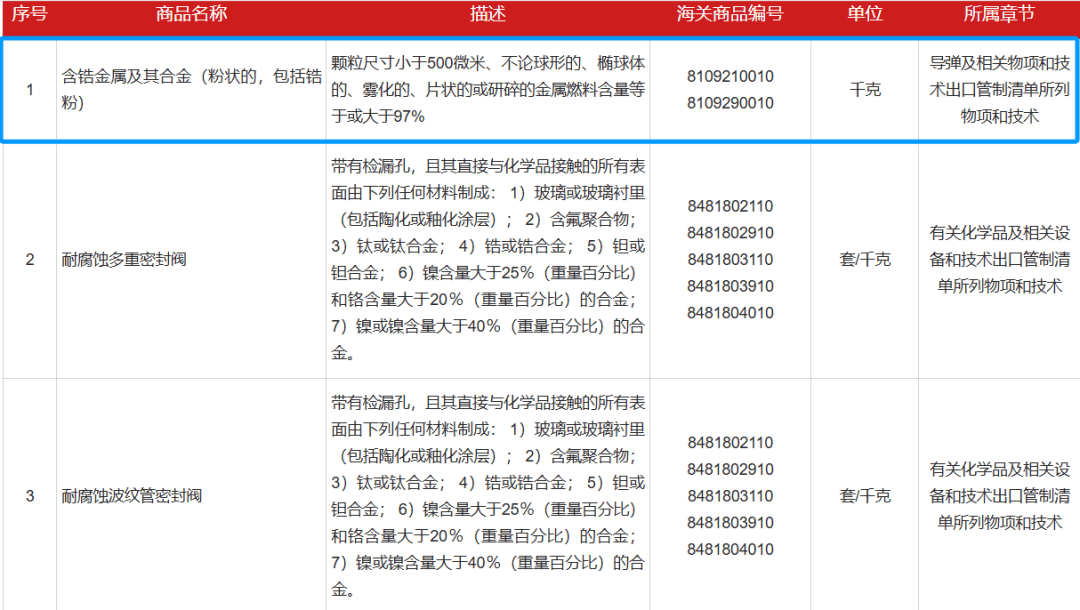 由此可见,本项针对“锆”相关管制产品,属于生产导弹的关键材料,针对的是军工领域。原来如此!