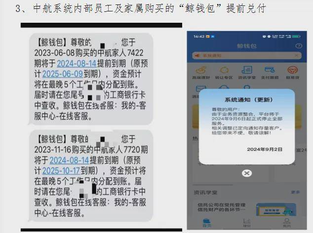 据该《举报信》陈述,中航信托通过“借新还旧”、“短贷长用”等构建资金池(如“天信系列”产品),掩盖真实资金流向。“2024年,中航信托内部员工通过‘鲸钱包’产品提前刚兑250亿元,而社会投资者产品自2025年2月起全面停兑,涉及金额超百亿元。”