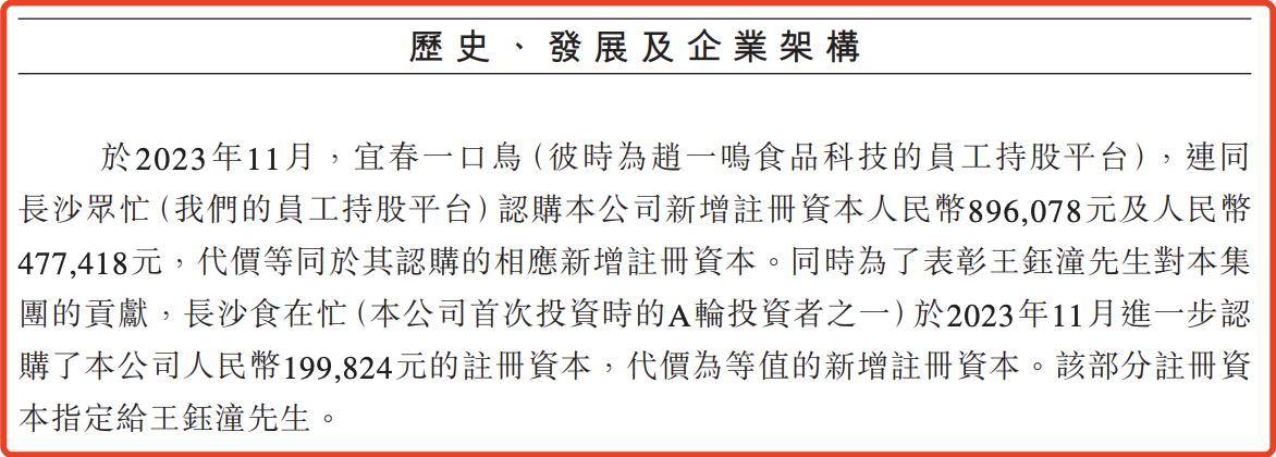 招股书显示,长沙食在忙(本公司首次投资时的A轮投资者之一)于2023年11月进一步认购了鸣鸣很忙人民币199,824元的注册资本,代价为等值的新增注册资本。据介绍,该部分注册资本指定给王钰潼。