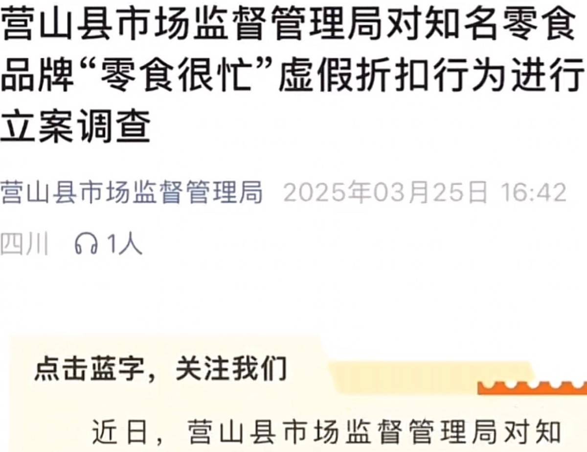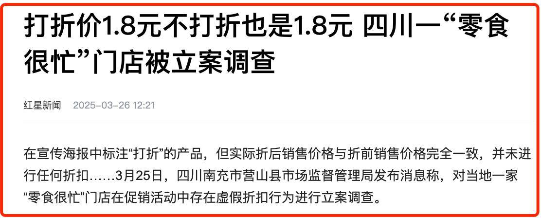 据红星新闻报道,2025年3月,四川省南充市营山县市场监督管理局发布消息称,对当地一家“零食很忙”门店在促销活动中存在虚假折扣行为进行立案调查。经查,“零食很忙”营山门店在宣传海报中标注“打折”的产品,实际折后销售价格与折前销售价格完全一致。