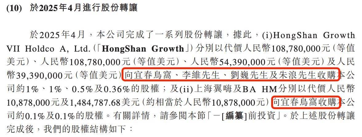 二问,赵一鸣零食创始人赵定到底“套现”了多少钱?招股书显示,赵定控制的宜春鸟窝于2025年4月向HongShan Growth VII Holdco A, Ltd.(下称“HongShan Growth”)转让鸣鸣很忙约1%的股权,作价人民币1.0878亿元。
