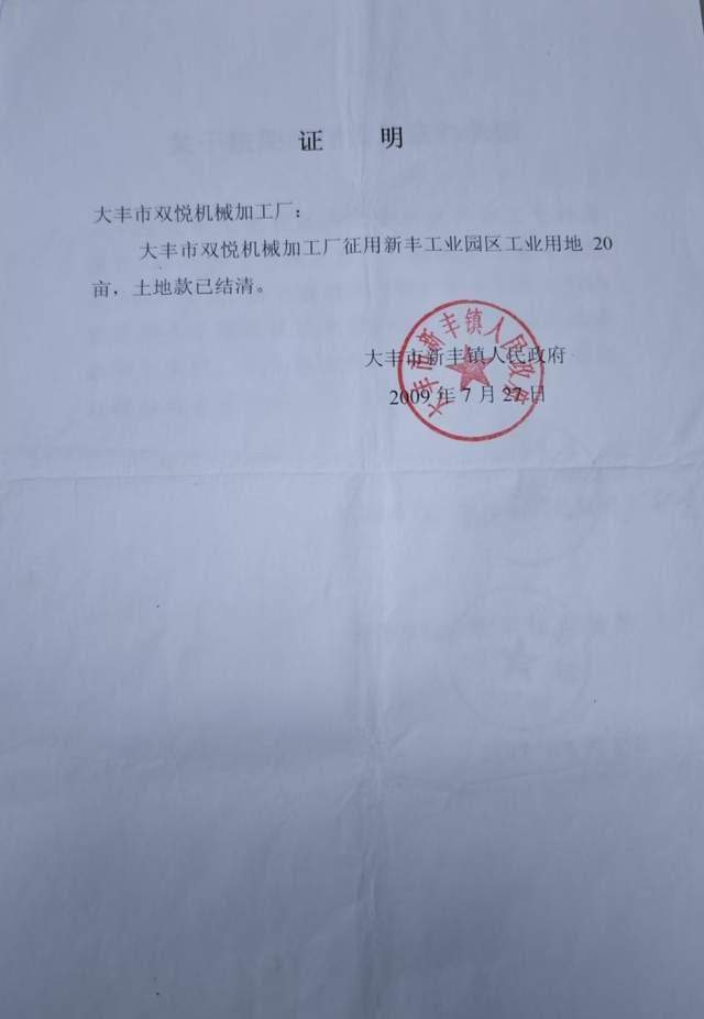 2009年7月22日,王先生缴纳20亩土地款,新丰镇政府开具土地款结清证明,且其注册的大丰市双悦机械加工厂标房面积已超协议约定的6000平方米。此外,新丰镇政府还出具《关于按期办理土地证的承诺》,承诺若因土地证办理不到位,按王先生投资造价的1.5倍赔偿其经济损失,由新丰镇人民政府作出承诺,新丰镇财政管理所作为担保单位。
