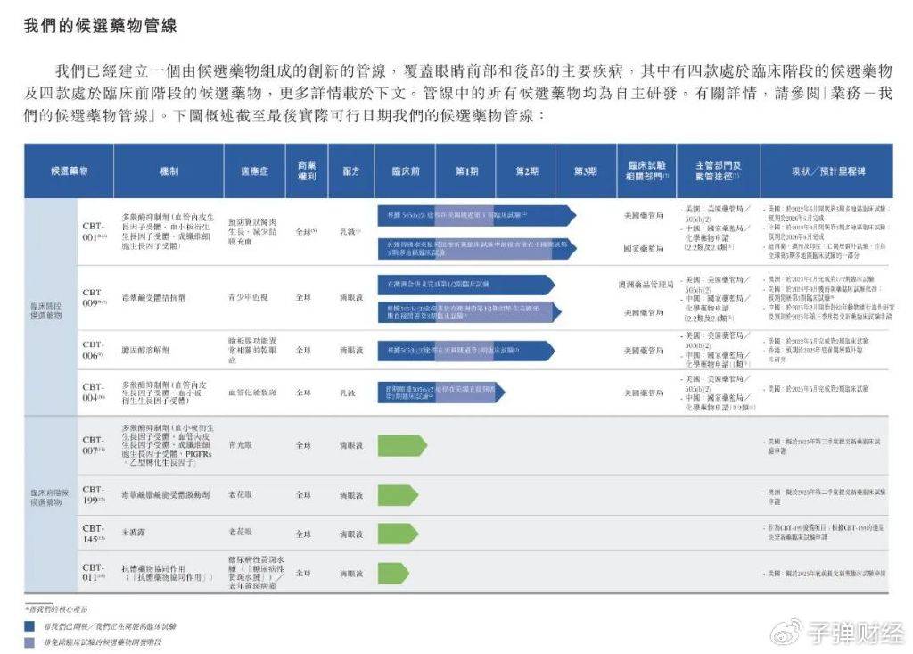 目前,拨康视云已经建立一个由候选药物组成的创新管线,覆盖眼睛前部和后部的主要疾病,其中有四款处于临床阶段的候选药物(即CBT-001、CBT-009、CBT-006和CBT-004)及四款处于临床前阶段的候选药物,均为自主研发。