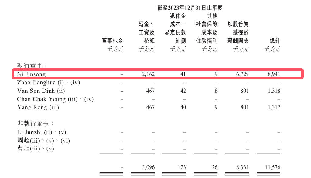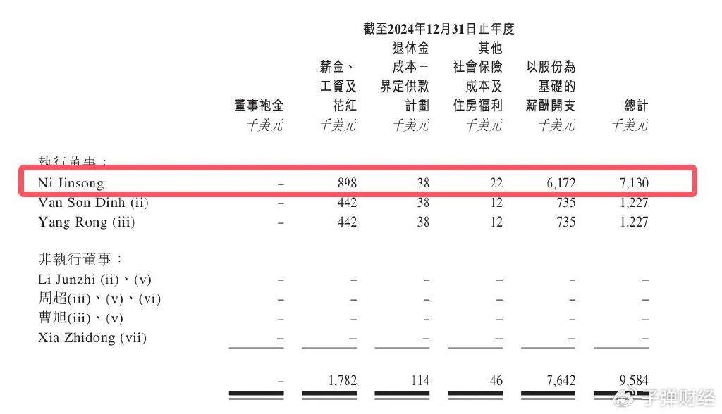 2022年至2024年,倪劲松薪酬总计分别为80.1万美元(约574万元)、894.1万美元(约6413万元)、713万美元(约5113万元),合计1.2亿元。
