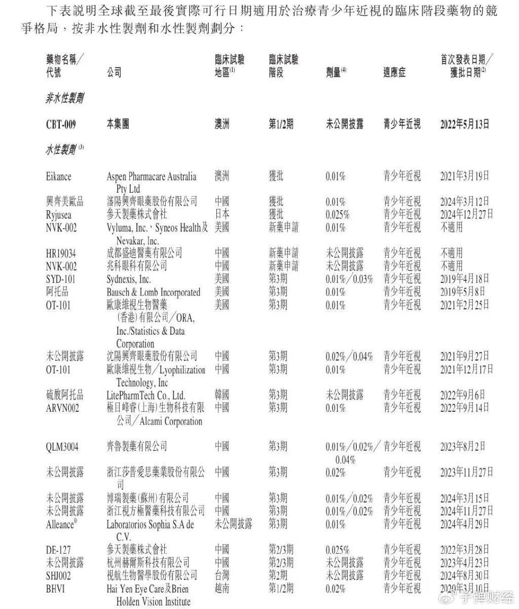 根据招股书,目前全球已获批用于延缓青少年近视的低剂量阿托品滴眼液共有三款,包括澳洲药品管理局批准的Eikance 0.01%滴眼液、中国国家药监局批准的兴齐眼药低浓度硫酸阿托品滴眼液(商品名“美欧品”)、在日本获批的Ryjusea 0.025%滴眼液。