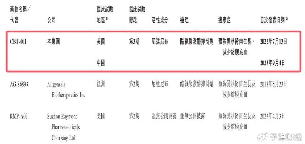 从竞争格局来看,CBT-001是翼状胬肉治疗药物中全球进度最快、中美双地区推进的核心产品。目前,公司已在纽西兰、澳洲及印度针对该产品进行第3期多地区临床试验。