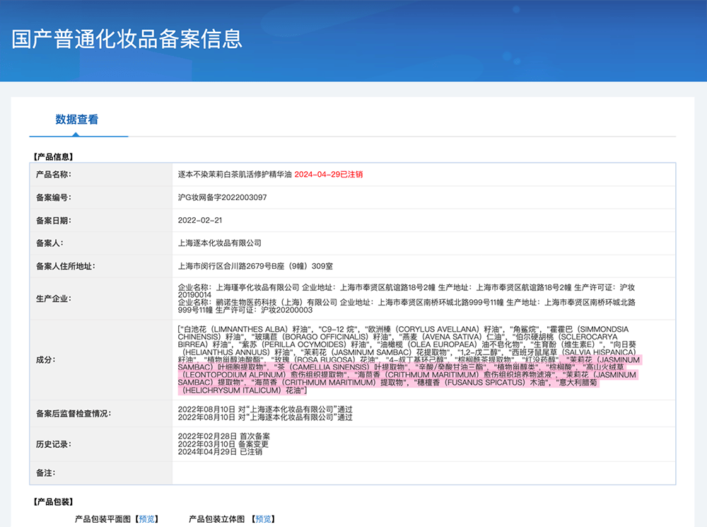 近日,广西的阳先生向澎湃新闻反映,他在电商平台“逐本”官方店铺购买了数十款产品,发现其中高端“墨红”系列产品的实际成分和备案不符,疑似使用月季净油冒充玫瑰精油进行备案和生产经营;“不染茉莉白茶”系列等多款产品疑似添加未收录进《已使用化妆品原料目录(2021年版)》(以下简称《原料目录》)的植物、生物技术新原料,并套用已使用化妆品原料进行备案生产;一些未经备案、非“妆字号”单方精油香薰,在产品页面和品牌社交账户上却宣称具有护肤功效。