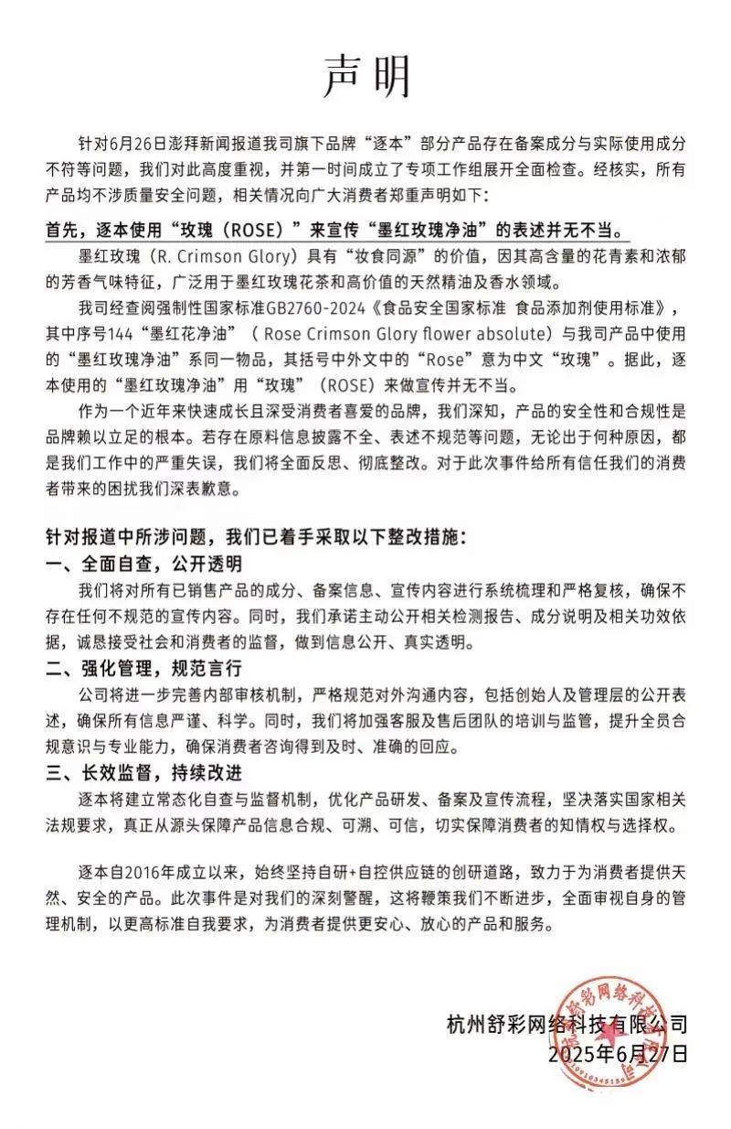 6月27日,逐本针对媒体报道的部分产品存在备案成分与实际成分不符等问题,于其官方公众号发表了声明,称所有产品均不涉质量安全问题,并且表示会启动全面自查,对已销售产品的成分、备案信息和宣传内容进行复核。针对创始人在直播时对功效的不当宣传,公司会强化管理,进一步完善内部审核机制,严格规范对外沟通内容,包括创始人及管理层的公开表述。