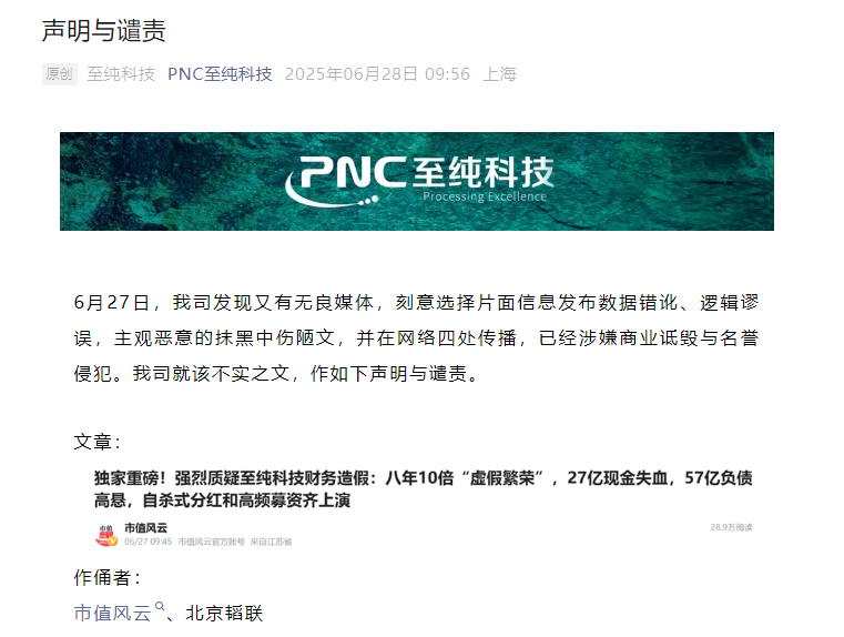 市值风云质疑至纯科技财务造假 后者回怼:预设立场缺乏专业