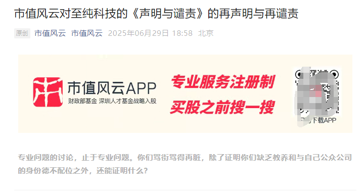 6月29日,市值风云又再次发文反击:“以为至纯科技能够实事求是、就事论事对异常数据给出合理解释,用数据、公开信息驳斥……没想到纵观整篇回复,除了唾沫星子乱溅的‘情绪价值’和‘抛开事实谈一切’的态度,并无实质内容。”