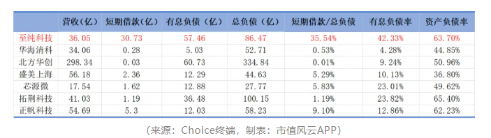 例如,在短期借款项目上,可比公司均控制在个位数亿级别,个别甚至不足1亿,占负债比重也普遍低于10%。但唯独至纯科技达到30.73亿,不仅是半导体设备龙头北方华创(002371.SZ)的千倍以上,在自身负债中的占比更是达到惊人的35.54%。