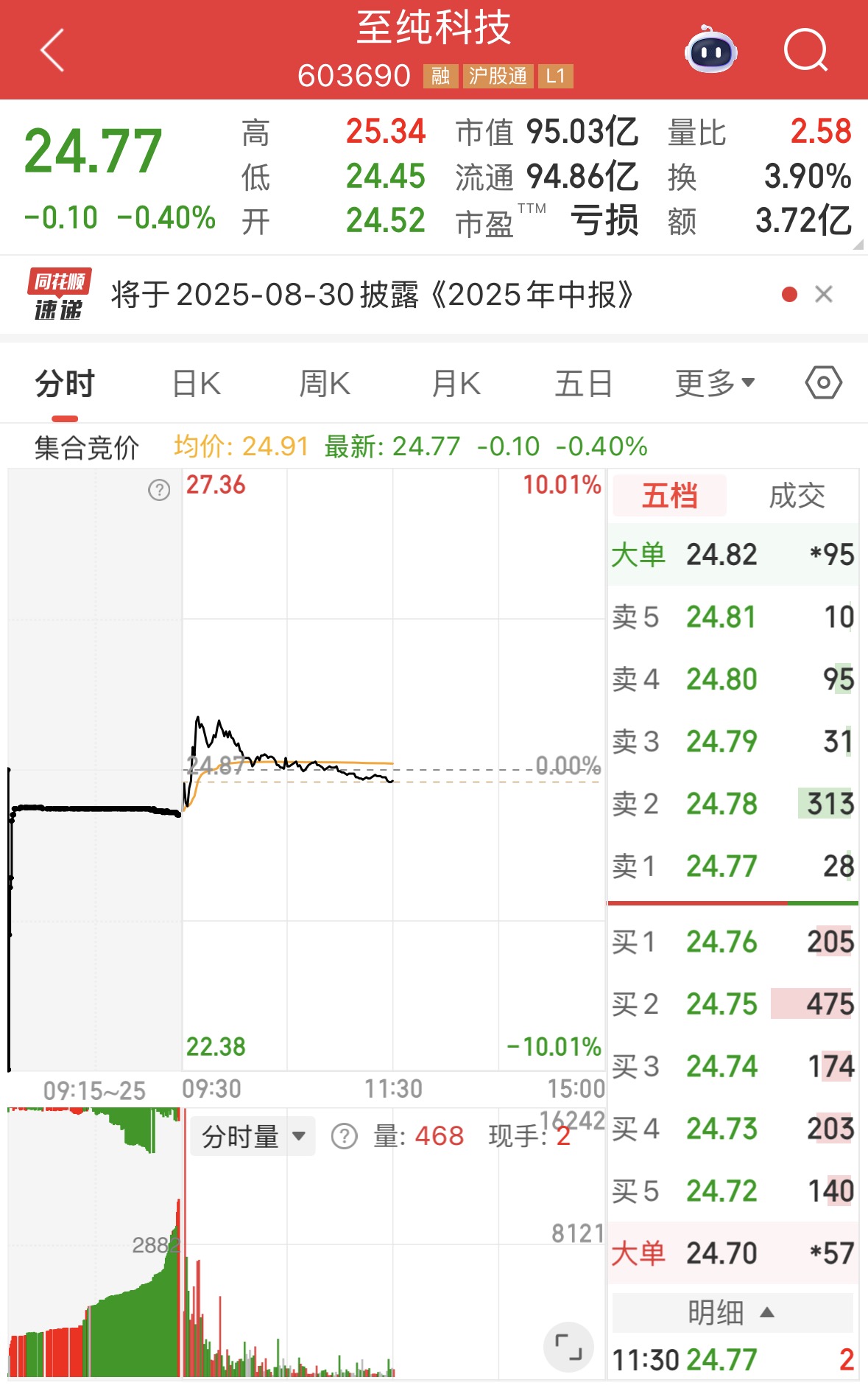 不过,在负面舆情发酵下,至纯科技股票于6月30日周一竞价期间一度出现跌停报价,早盘低开。