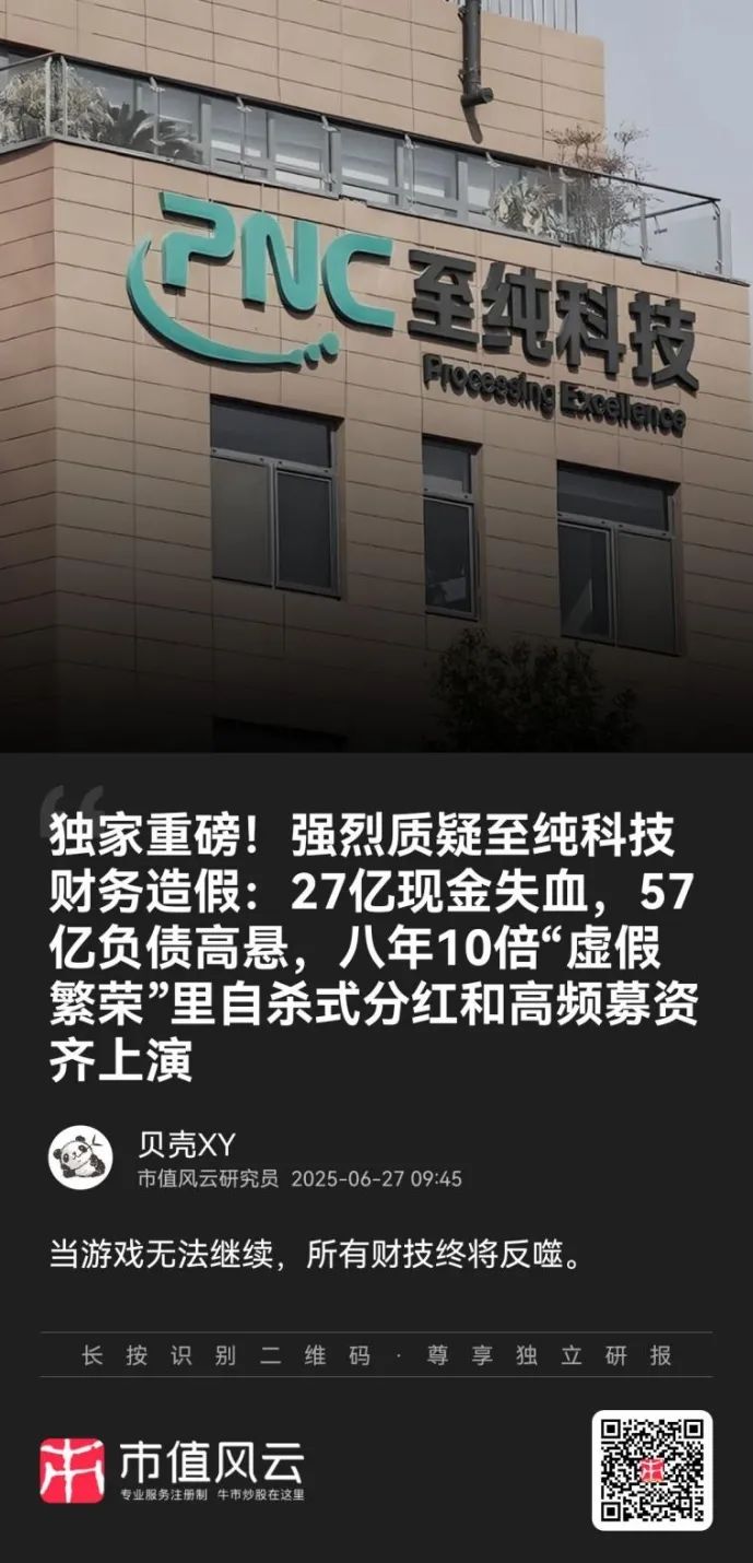 6月27日晚间,财经自媒体市值风云发布了一篇题为《独家重磅!强烈质疑至纯科技财务造假:27亿现金失血,57亿负债高悬,八年10倍“虚假繁荣”里自杀式分红和高频募资齐上演》的财经分析长文,直指至纯科技存在多项财务异常,疑似存在财务造假行为。