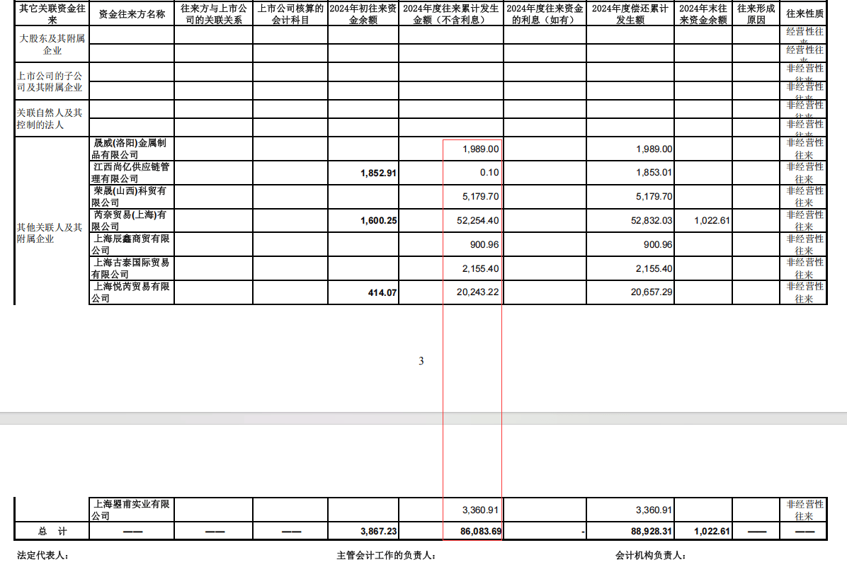 据审计机构出示的专项说明,金力泰在2024年度通过与芮奈贸易(上海)有限公司(以下简称芮奈贸易)、江西尚亿供应链管理有限公司、上海悦芮贸易有限公司等贸易商(以下统称相关贸易商)于每季度初签订采购协议并向相关贸易商转出资金,于每季度末签订采购解除协议由相关贸易商转回资金。