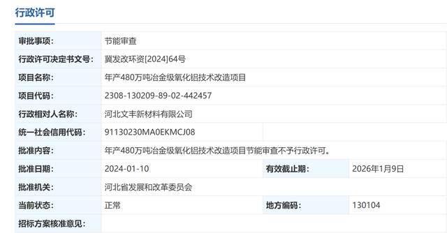 不过,2024年1月10日,河北省发改委官网显示,上述项目在“节能审查”环节被出具“不予行政许可”。