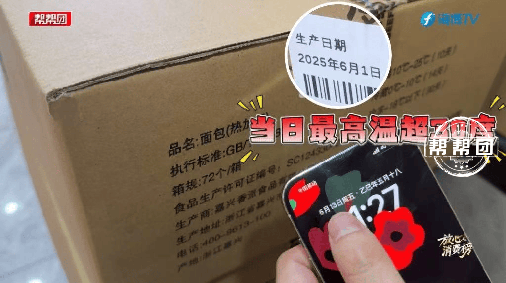 在门店过道处,记者发现了两箱尚未开封的面包胚。箱体标签显示,这批面包胚生产日期为2025年6月1日,标注“常温保质期10天”,而当日已为6月13日。
