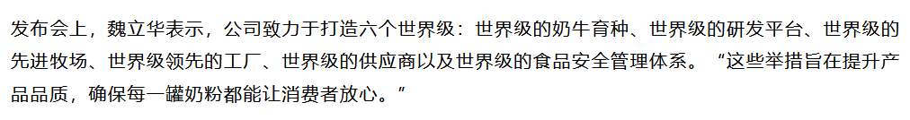 5月25日,君乐宝乳业集团举办奶粉战略发布会,创始人魏立华表示,公司怀揣打造世界领先配方奶粉的梦想,致力于构建“六个世界级”体系,涵盖奶牛育种、研发平台、先进牧场、领先工厂、优质供应商以及食品安全管理体系。“这些举措旨在提升产品品质,确保每一罐奶粉都能让消费者放心。”