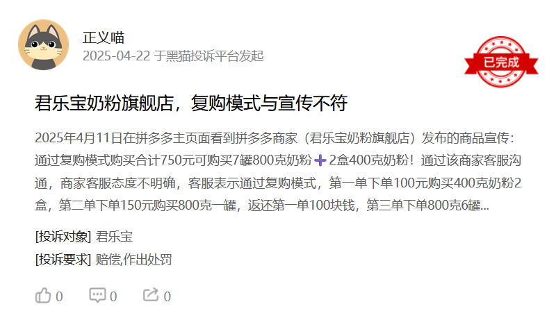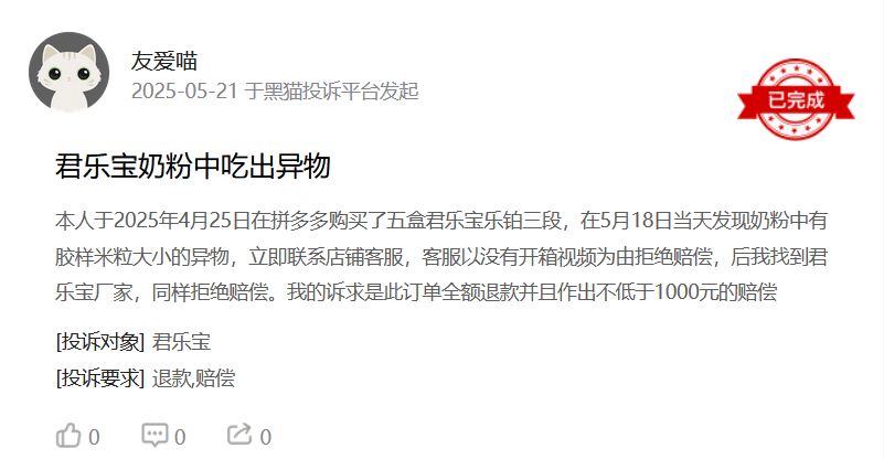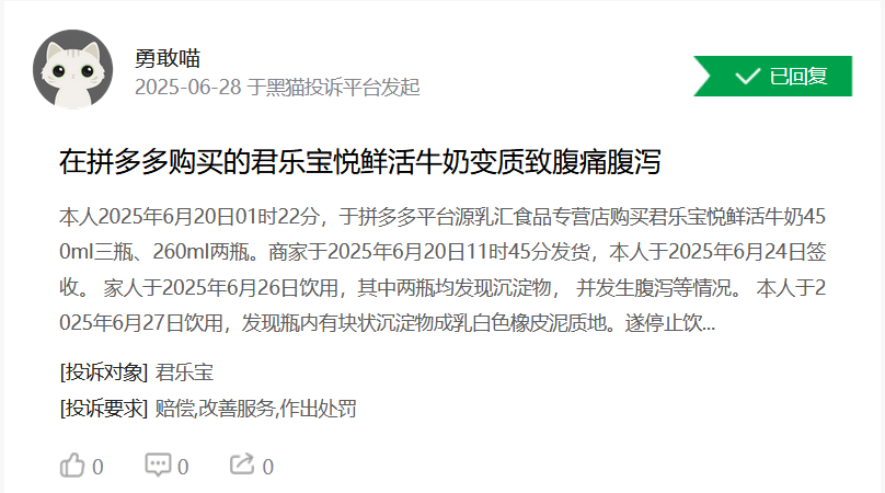 除了生产日期问题,君乐宝乳制品还多次陷入食品安全争议。截至2025年6月28日,在黑猫投诉平台上,君乐宝相关投诉多达868条,问题涉及异物、保质期内变质等多个方面。2025年6月,有消费者在拼多多君乐宝乳品官方旗舰店购买的酸奶在保质期内变质,孩子食用后出现腹泻肚子疼的情况。2025年5月,有消费者购买的君乐宝奶粉吃出米粒大小的异物,客服以没有开箱视频为由拒绝赔偿。