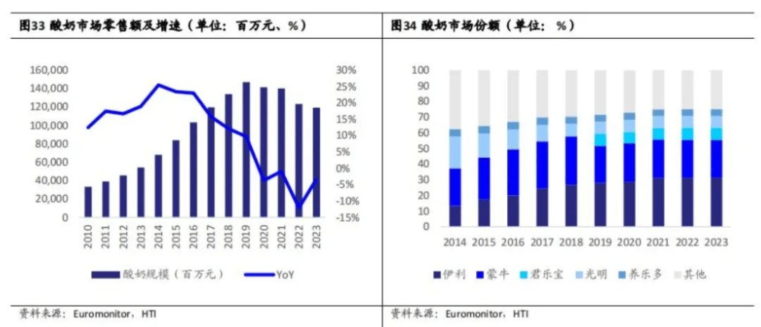 奶粉方面,根据尼尔森数据显示,2023年前9个月,按线下销售额计算,在婴幼儿奶粉市场中,中国飞鹤和伊利的市场份额分别为23%和14%,而君乐宝仅为9%。