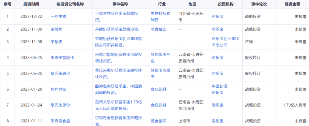 为了寻求新的增长点,君乐宝走上了快速扩张的道路。公司持续加大在乳制品产业链上下游的布局力度,优化供应链,实现业务多元化战略。2020年以来,君乐宝先后完成了8次投资并购,投资标包括思克奇食品、酪神世家、茉酸奶等。通过并购公司不仅夯实了奶源基本盘,还迅速切入了奶酪棒、现制酸奶等赛道。
