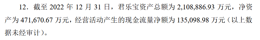 到了2022年底,君乐宝未经审计的财务数据为资产总额约210.89亿元,净资产约47.17亿元,负债率仍高达约78%。同一时期行业内18 家上市乳企平均资产负债率仅为45.06%。