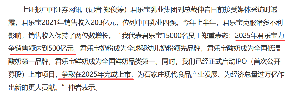 君乐宝乳业高管曾在2022年接受媒体采访时表示,“2025年君乐宝力争销售额达到500亿元”、“争取在2025年完成上市”。距离2025年结束仅剩半年,要完成两大目标难度着实不小,