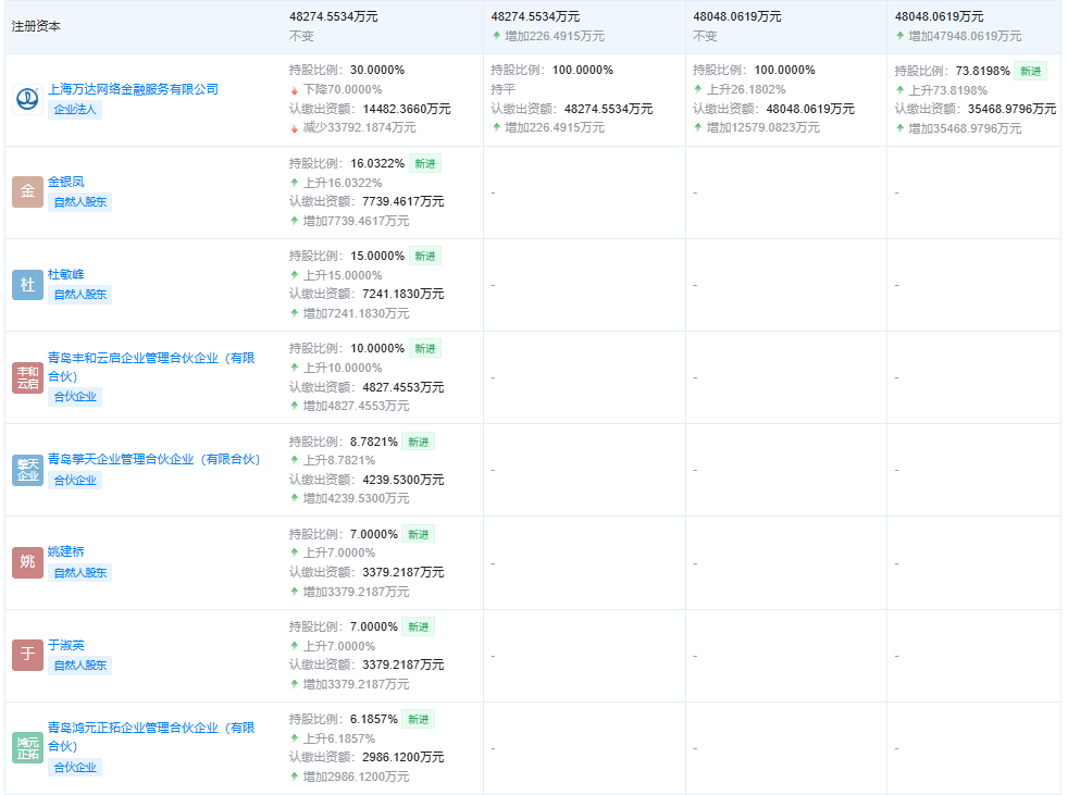 2024年11月,三家位于青岛的合伙企业和杜敏峰、于淑英等自然人进入快钱金融的股东名单,万达金融持股比例从100%大幅降至30%。今年3月,万达金融将所持全部股权出质给深圳常盛私募股权基金管理有限公司,出质股权数额14482.366万元。